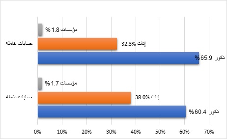 كما يوضح الشكل (4) إجمالي عدد الحسابات المفتوحة النشطة والخاملة وفق التوزيع الجندري كما في نهاية الربع الثاني من العام 2025 في بورصة فلسطين، والبالغة 126,043 حساباً. ويلاحظ أن مشاركة الذكور أكبر من الإناث في قطاع الأوراق المالية.